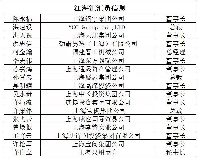 江海汇:“江海汇”由二十余位晋江籍全球企业家低调发起筹备近两年时间,于2015年7月18日在上海正式举行隆重的筹备会,正式宣告这一新生的闽商组织创立启动。以“江海汇,汇江海”为主旨的“江海汇”,有着相同地缘身份和文化根基并在各自产业领域获得成功的闽商领袖们,希望通过切实深入的沟通分享,搭建起一个能够对闽籍企业家产生向心力的社交聚合平台,建树并弘扬全新闽商精神与商业文明的会员型组织。“江海汇”提出了“成为全球闽商组织的楷模”的愿景和“助力汇员成就伟业,成为汇员精神家园”的使命,提出了“挑战、成长、信任、关怀”的价值观,明确了“企业发展、家族治理、商业合作”三位一体的组织定位,并一致通过将“善观时变,顺势有为;敢冒风险,爱拼会赢;合群团结,豪侠仗义;合群团结,豪侠仗义”的闽商精神,作为“江海汇”秉持的组织宗旨和行动指引。