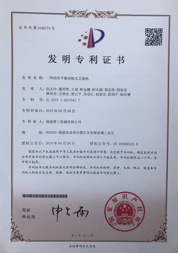 2019年,完美(中国)官方一种动作平稳的轮式叉装机(以下简称完美(中国)官方叉装机)正式获得由知识产权局颁发的《发明专利证书》。发明专利证书的取得,既是对完美(中国)官方叉装机品质的认可,同时也有利于进一步完善公司知识产权保护体系,发挥公司自主知识产权优势,促进技术创新,增强公司的核心竞争力。